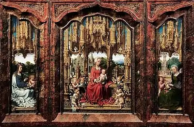 In its original frame, this small house altar is the artist's only surviving intact triptych. Maryan Ainsworth on the basis of connoisseurship assessed that the external landscape was painted by Gerard David. Gossart and David also worked together on the figures of the interior panels.[2]