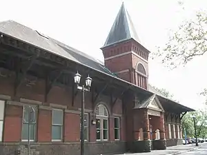 The station building was originally located at track level next to the New York, New Haven and Hartford Railroad (NH) platforms. The building was moved down an embankment to its present location in the 1920s to accommodate the construction of the New York, Westchester and Boston Railway (NYW&B) and separate tunnels connected the building to the respective railroad's platforms.[6] A second NYW&B depot was also built in the Larchmont Gardens neighborhood to the northeast, which today is a Girl Scout building. Subsequent to the abandonment of the NYW&B in 1937, the area formerly occupied by the building and NYW&B platforms and tracks was converted to parking, and the building remained at the bottom of the embankment on Station Plaza, adjacent to Columbus Park. The tunnel to the NYW&B was sealed, and the exits to the former NYW&B platforms covered. The tunnel to the NH platforms remained open. Unlike many other stations on the line, the Mamaroneck station does not include a pedestrian overpass. The NYW&B tunnel became a wine cellar following the renovation of the station building, and its repurposing as a restaurant. [7]