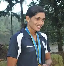 Mamatha Poojary (born 1986) is an Indian professional international kabaddi player. She is the former captain of the Indian women's Kabaddi team and has been awarded the Rajyotsava Prashasti, the second-highest award of the Government of Karnataka. On 2 September 2014 she was conferred with the Arjuna Award by President Pranab Mukherjee in recognition of her achievements in Kabaddi.[1]