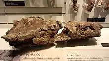 In 1978, an incomplete sauropod humerus (NSM PV17656) found in a layer of the Early Cretaceous-aged Miyako Group of Japan was considered to probably belong to Mamenchisaurus. In 1991, it was referred to ?Mamenchisaurus sp. by Hasegawa and colleagues.[27][28] However, the humerus was reassessed by Azuma & Tomida in 1998, and Barrett and colleagues in 2002. These authors could not find any distinguishing features that could place the humerus into a specific sauropod group. They regarded it as an indeterminate sauropod.[29][30] The remains were given an informal name "Moshi-ryu"; "Moshi" being the local name for the location it was discovered, and "ryu" being Japanese for dragon[27]—also referred to as "Moshisaurus".[28]