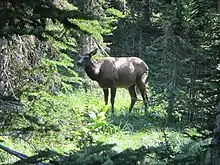 The elk, or wapiti (Cervus canadensis), is one of the largest species of deer in the world and one of the largest mammals in North America and eastern Asia. In the deer family (Cervidae), only the moose, Alces alces (called an "elk" in Europe), is larger; the sambar deer (Cervus unicolor) of Southern Asia, as well as the European red deer (Cervus elaphus) of Europe & Northern Africa, also rival C. canadensis in size. Elk range in forest and forest-edge habitat, feeding on grasses, plants, leaves, and bark.