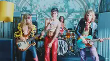 Featuring "acid" and "pulp" colours,[36][38] the video begins with De Angelis commenting that "[David is] so fucking annoying". First, it cuts to the drummer Ethan Torchio's fantasy, where he drowns David in a toilet which they both urinated in earlier.[39] After that, a writing appears on the bathroom's wall, reading "rest in piss".[6] The next fantasy is De Angelis' one, where she is interrupted by the singer while kissing with a female fan.[39] She chooses to kill him with a kitchen knife.[6] Måneskin guitarist Thomas Raggi's fantasy is the last one, where he kills the frontman by smashing an electric guitar over his head for taking a cigarette from his mouth.[38] During the song's bridge, the band is seen in a bloody imagery,[34] while the clip ends on David catching them up and taking the cassette tape out, saying that he "hate[s] this fucking song".[32]