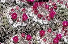 Mammillaria standleyi[2] is a species of the family Cactaceae native to the Sierra Madre Occidental of Sinaloa, Chihuahua and Sonora. It has red-purple flowers surrounded by cottony pubescence. Fruits are red and edible, tasting like apples, although too small to be of much food value to humans.[3]