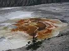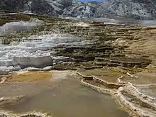 Mammoth Hot Springs is a large complex of hot springs on a hill of travertine in Yellowstone National Park adjacent to Fort Yellowstone and the Mammoth Hot Springs Historic District.[3] It was created over thousands of years as hot water from the spring cooled and deposited calcium carbonate (over two tons flow into Mammoth each day in a solution). Because of the huge amount of geothermal vents, travertine flourishes.[4] Although these springs lie outside the caldera boundary, their energy has been attributed to the same magmatic system that fuels other Yellowstone geothermal areas.