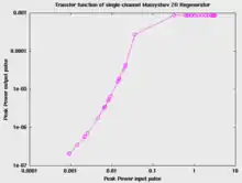 An important property of a Mamyshev regenerator is its transfer function that links the output peak power to the input peak power. For an efficient operation and power equalization, this transfer function should exhibit a marked plateau at the 1's power level.[9] Example of a transfer function is provided Figure 2.
