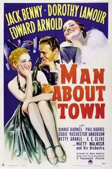 Man About Town is a 1939 musical comedy film starring Jack Benny, Dorothy Lamour, and Edward Arnold. The screenplay concerns a producer who tries to get his leading lady to take him seriously romantically by pursuing other women.