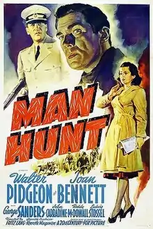 Man Hunt is a 1941 American thriller film directed by Fritz Lang and starring Walter Pidgeon and Joan Bennett.[1][2] It is based on the 1939 novel Rogue Male by Geoffrey Household and is set in Europe just prior to the Second World War. Lang had fled Germany into exile in 1933 and this was the first of his four anti-Nazi films, which include Ministry of Fear, Hangmen Also Die!, and Cloak and Dagger. It was Roddy McDowall's first Hollywood film after escaping London following the Blitz.[3] Man Hunt was one of many films released in 1941 that were considered so pro-British that they influenced neutral members of the U.S. public to sympathize with the British side in World War II.[4]