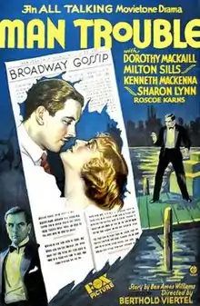 Man Trouble is a 1930 American pre-Code drama film directed by Berthold Viertel and written by Marion Orth, George Manker Watters and Edwin J. Burke. The film stars Milton Sills, Dorothy Mackaill, Kenneth MacKenna, Sharon Lynn, Roscoe Karns and Oscar Apfel. The film was released on August 24, 1930, by Fox Film Corporation.[1][2][3]