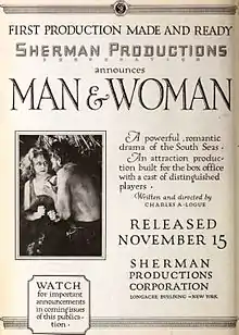 Man and Woman is a 1920 American silent drama film produced by A. H. Fischer, Inc. Directors were Charles Logue and B. A. Rolfe with Gene O'Donnell and Conrad Wells (as A. Fried) as cinematographers. Logue wrote the story and the screenplay.