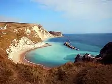 Man o' War Cove (or Man of War Bay and similar names) lies on the Dorset coast in southern England and is flanked by the rocky, steep and slightly projecting headlands of Durdle Door to the west and Man O War (or O' War) Head to the east.