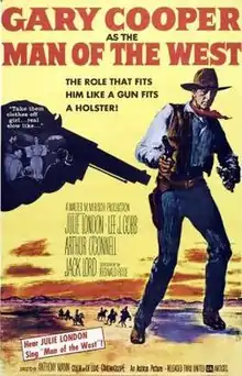 Man of the West is a 1958 American Western film noir[3] film starring Gary Cooper and directed by Anthony Mann, produced by Walter Mirisch and distributed by United Artists. The screenplay, written by Reginald Rose, is based on the 1955 novel The Border Jumpers, by Will C. Brown. Julie London, Lee J. Cobb, Jack Lord, and Arthur O'Connell co-star with John Dehner, Robert J. Wilke, and Royal Dano in supporting roles. The film is one of Cooper's final Westerns.