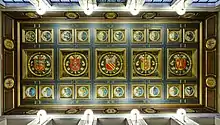 The ceiling decorations include the arms and crests of the Duchy of Lancaster, the See of York, the See of Manchester, the City of Manchester, and Lancashire County Council. The walls of Shakespeare Hall are covered with Hopton Wood stone quarried in Derbyshire. On the walls are the arms of The Manchester Grammar School, Manchester University, the Manchester Regiment, Humphrey Chetham, the Overseers of the Township, England, St. George, St. Mary (patron saint of Manchester), and over the memorial window, Shakespeare.