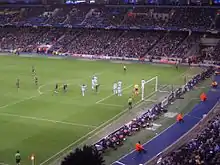 By the 2002–03 season, Manchester City were back in the Premier League. An unusual route into European competition for the 2003–04 season was provided by the UEFA Respect Fair Play ranking, which allocated extra UEFA Cup qualifying round places for the leagues with the best records for discipline and positive play.[45] This marked Manchester City's first European participation for 24 years. In the qualifying round City played Welsh club Total Network Solutions. The first leg was the first-ever competitive match at Manchester City's new ground, the City of Manchester Stadium. Trevor Sinclair became the first ever goalscorer at the stadium in a 5–0 win.[46] In the hope of attracting a large crowd, TNS switched the second leg to Millennium Stadium, the national stadium of Wales.[47] With the tie effectively won, City made 10 changes to their team.[48] The match finished 2–0 to City. Against Sporting Lokeren in the first round proper, City won the home leg 3–2, and the away leg 1–0.[49] A tie against Groclin Dyskobolia followed. Both legs were drawn,[50] and just as in 1976, City were eliminated on away goals after a 0–0 draw in Poland.