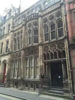 Designed by Thomas Hartas,[1] the library was built by William Holt between 1884 and 1885 to provide a meeting place, and reading room, for the Manchester Law Society.[2] The building has a fine Venetian Gothic facade, "three bays, each divided into three again with richly traceried and strongly moulded frames to the openings".[1] Internally, a lending library is located on the ground floor, "now with twentieth century furnishings.[1] On the first floor, a reading room "with most of the (slightly rearranged) attractive, original fittings."[3] These include the central oak table, three fireplaces, and tall bookcases, some set at right angles to the walls to maximise the available storage space. The "stained glass is a noteworthy feature (including) three roundels containing the images of bewigged judges".[2] Offices are above this. "The building is noteworthy by virtue of having been built for the purposes of a law library and, London and the old universities aside, it is believed to have performed this function for a period longer than any other provincial law library".[2]