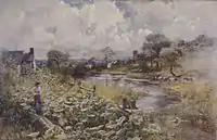"In company with his friend, R O Bottomley, he did much work in and around Chadderton Fold, which in the seventies was a rural hamlet. He was to be seen there frequently between 1870 and 1880, and got much of the groundwork for his illustrations for the works of Edwin Waugh, Ben Brierley and Samuel Laycock."[10]
