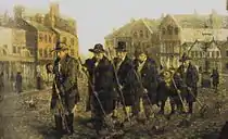 A number of his paintings can be seen in Gallery Oldham, including the depiction on the right showing Oldham's cobbled Market Place being swept clean by a gang of street sweepers.