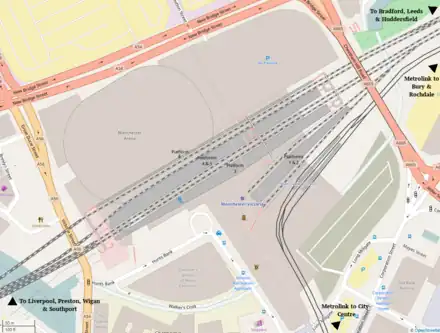 Manchester Victoria has six railway platforms and the Metrolink stop has four (four platform faces on three tracks). Two railway platforms are bays numbered 1 & 2 for terminating trains arriving from the east and four are through platforms numbered 3–6 at the northern side of the station. The Metrolink platforms are parallel to, and south of, the bay platforms. Only the bay and Metrolink platforms are under the new roof, the through platforms 4, 5 and 6 are mostly covered by Manchester Arena.