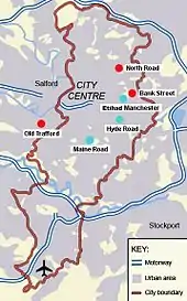 City: Hyde Road (1887–1923), Maine Road (1923–2003), City of Manchester (2003–present).