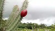 The flowers are white and about 250 mm (10 in) long. The flower buds usually appear in the middle of spring and each flower lasts only for a night. They blossom at dusk and wither by the morning. Its fruit has a very strong violet color. The pulp is white with tiny black seeds, and it is considered very tasty. Many birds feed on them, like the "gralha-cancã" and the "periquito-da-caatinga" from Brazilian caatinga.