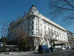 The chosen site was once an area occupied by barracks belonging to the Hippodrome Circus and the gardens of the old Theatre Tivoli, and was formerly owned by Jardines del Buen Retiro de Madrid.[5] The hotel's grand opening on 2 October 1910 was officiated by King Alfonso XIII in the company of ministers and representatives of the mayor of Madrid.[6] The hotel quickly became one of the leaders of the social and cultural life of the capital. The first board was chaired by Luis de Cuadra y Raúl Marquis de Guadalmina. The first hotel manager was Antonio Mella, who had previously managed the Ritz Hotel in Paris and London. His wife helped him in hotel management taking over guest services and laundry rooms.