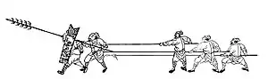- 2 men with multiple-tip spears (lang xian shou 狼筅手)