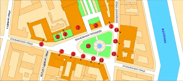 | 3 — Mikhailovsky Manege (Zimniy Stadion) | 10 — Apartment house | |