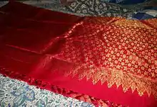 Before marriage, women used to wear a Kirgi (sari) and Baju (blouse). The Kirgi is a piece of cloth not longer than four feet, and about three feet wide. It was wrapped around the body from the waist down. A jacket with long sleeves called a Baju, was used to cover the upper part of the body. This dress was a sign of the bride's virginity and was worn during the Ros ceremony.[196][199] The Kirgi was wrapped around the waist, but the end of the sari is not thrown over the shoulder.[199] To wear the sari with its end thrown over the shoulder, known as Worl, is the exclusive right of a married woman.[200] Married women used to wear sarees the general way.[201] The Salwar kameez is another form of popular dress for females. The Mangalorean Catholic bride's wedding sari is known as a Sado.[e][202] It is usually a red-coloured Banarasi sari which is made of finely woven silk and is decorated with elaborate engravings.[194] In olden days, the bride wore on her head a red cloth, three feet square. Gold ornaments were absent in those days: the bride went to the church dressed as a virgin girl. In modern times, the bride wears (in place of the Kirgi) a red sari, but the end of the sari is not thrown over the shoulder; it is wrapped around the waist. The bride wears a few gold ornaments, some rings on the fingers, earrings, and at least two of the Dantoni (golden combs).[202] Other ornaments worn by the bride in the olden days included Kanti, Chakrasar, Kap, Karap, Mugud, Kanto, and Dantoni.[199]