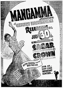 Mangamma Sabatham (transl. Mangamma's vow) is a 1943 Indian Tamil-language film, starring Vasundhara Devi, Ranjan, N. S. Krishnan and T. A. Mathuram. The film was produced by S. S. Vasan and directed by T. G. Raghavachari, credited as Acharya.[1] The film was remade in Hindi and Telugu as Mangala (1950 and 1951), in Sinhala as Mathalan (1955) and again in Telugu as Mangamma Sapatham (1965).