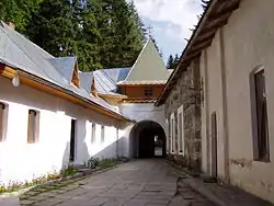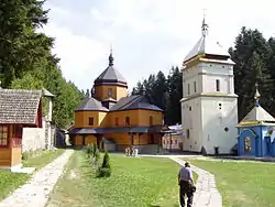 Manyava Skete of the Exaltation of the Holy Cross, (transliterated often as Maniava or Manjava Skete) - otherwise known as Ukrainian Athos, is an Orthodox solitary-cell men's monastery (skete) in the Carpathian mountains of western Ukraine. It is situated on the outskirts of the village of Maniava in Ivano-Frankivsk Raion of Ivano-Frankivsk Oblast and belongs to the Ukrainian Orthodox Church of Kyiv Patriarchate. Hegumen of the monastery is Ioasaf, metropolitan of Ivano-Frankivsk and Halych. Currently there are 8 monks residing at the monastery.