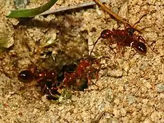| Worker of Manica rubida at the nest entrance | |