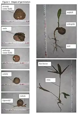 The fruits grow in large clusters throughout the year, forming in shells that contain two or three seeds each. The pods fall from the tree and form mounds at the base. Eventually the spiked outer shell of the pod breaks away, revealing the smooth round seed underneath. Some mammals, such as peccaries, eat the white flesh found inside seeds that have fallen and emerged from the tough outer shell, but human consumption of this fruit is not common (Myers, 1981). Since the seeds can float for extended periods of time, water is the main seed distribution method for the Manicaria. Seed dispersal by animals is not effective; Myers (1981) found that seeds which were partially consumed or damaged by animals were not likely to germinate (See Fig. 1). Where mammal activity is high, seed and seedling predation are also very high, so the Manicaria tends to thrive only in swampy regions that are less frequented by mammals.