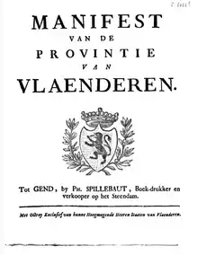 The Manifesto of the Province of Flanders (1790 Dutch: Manifest van de Provintie van Vlaenderen; modern Dutch: Manifest van de Provincie Vlaanderen) was the declaration of independence of the county of Flanders on 4 January 1790, during the Brabantine Revolution. On this day, the States of Flanders "solemnly declare[d] in the name of the People, the province of Flanders to be an independent State, and definitively withdrawn from its loyalty and obedience to emperor Joseph II, count of Flanders, and from the House of Austria."[1] The States also declared "all officials, lieges and other servants, whoever they may be, free and absolved from all concluded and indebted contracts, and discharged from every oath done to the fallen count of Flanders."[2]