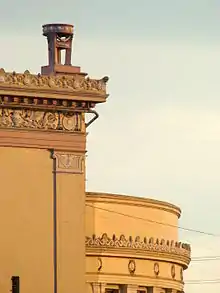 Considered to be Juan Arellano's magnum opus, it was designed in the neoclassical style that expressed order and balance. It was built in 1926 and was worth one million pesos. Fronting the huge, rectangular volume are the 16 Ionic pillars lined that are lined up above the steps just before entering the lobby.[5] The main body of the building is capped by a recessed rectangular attic storey and flanked and buttressed by two semi-circular wings. Inside, the main lobby has subsidiary halls at each end housed under the semi-circular spaces roofed with domes.[4]