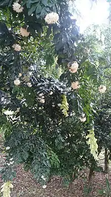 Maniltoa grandiflora is a species of plant in the family Fabaceae.[1] Common names includes handkerchief tree and pokok sapu tangan.[1] This plant has a synonym Maniltoa brawneodes. It can grow from 5 m to 15 m.[2] The stem is straight, round, brown and sympodial. Its leaf is green, pinnate, elongate with smooth margin, and pointed at both ends,[2] with dimension of 7โ14 cm long, 3โ8 cm wide with 1โ1,5 cm long petiole.[2] Its root develops from the radicle and is brownish white.[2] The leaves, fruits, and bark of this plant contains saponin, flavonoid, dan polyphenol.[2]