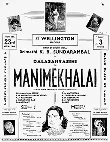 Manimekalai is the first film based on the Chithalai Chathanar-written epic of the same name, one of the Five Great Epics of Tamil literature.[2] It was directed and photographed by Bomman Irani, and produced by T. Krishnachand under T. K. Productions while the screenplay was written by A. M. Somarajulu and S. Ramaiah. The final length of the film was 17,500 feet (5,300 m).[3] The film was launched in 1938, but took a long time to complete due to various reasons, mainly financial. Additionally, distributors were reluctant to pick the film up even after its completion.[2]