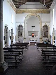 The basic floor plan of the Portuguese Plain Style was defined by a single rectangular nave, without transept and dome, and with a chancel at the back, where the main altar was located, bordered by a large cross arch, at the ends of which two secondary altars could be installed, or none at all. Especially important buildings could have three naves or other secondary altars installed in niches along the single nave. On these altars, especially, the decorative richness that the conditions of each site could allow was applied.[26][1] According to Gustavo Schnoor, it is possible that this model was inspired by Portuguese Gothic churches with a single nave.[28]