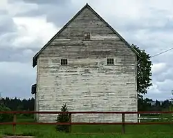 The 2.22 acres (0.90 ha) farm has nine other buildings organized in a rectangular pattern, with the home in the middle, the barn to the west, and the privy on the eastern boundary.[3][5] The original two-story barn is the oldest and largest of these remaining buildings.[1] Built of hand hewn timber posts, it measures 35 feet (11 m) by 70 feet (21 m) and has white shiplap siding. The two newer barn buildings and the older portion form one interconnected building.[1] These newer parts are one story tall, with the middle one measuring 20 feet (6 m) by 30 feet (9 m) and the northernmost 20 feet (6 m) by 20 feet (6 m).[5] White board and batten siding was used on the middle portion that was built around 1910 and tongue and groove siding on the end section added about 1920. The barns were used for the seed growing operation of the farm.[1]