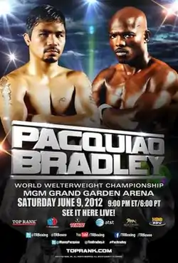 Manny Pacquiao vs. Timothy Bradley, was a welterweight title boxing match held on June 9, 2012, at the MGM Grand Garden Arena in Paradise, Nevada.[1] After 12 rounds, Bradley won a highly controversial split decision to take the WBO welterweight title.[2][3]