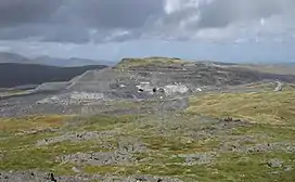 It lies directly to the north of its parent Manod Mawr, separated by the Graig Ddu Quarry. Crossing the quarry to reach the main summit can be dangerous. There are also a few mine adits on the northern slopes.[1] There were fears that the top may eventually be removed.