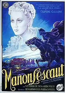 Manon Lescaut is a 1940 Italian historical drama film directed by Carmine Gallone and starring Alida Valli, Vittorio De Sica and Lamberto Picasso.[1] It is an adaptation of the Abbé Prévost's novel of the same title.