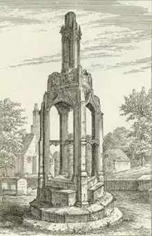 Robert Poyntz (1349–1439), son by his father's first marriage. He was MP for Gloucestershire in 1415 and 1417 and Sheriff of Gloucestershire 1396-7. He was steward between 1405–1416 of the estates of Anne of Gloucester (died 1438), dowager Countess of Stafford in Glos., Hants., and Wilts. and by 1439 was steward of the manor of her son Humphrey Stafford, 6th Earl of Stafford(died 1460) at Thornbury Castle.[8] Robert's surviving ledger stone in Iron Acton Church depicts a knight, almost life-size, wearing a helmet with the body in plate armour with a skirt of traces. He wears a gorget with slight traces of chain-mail, round shoulder pieces, brassarts on the arms, gauntlets with pointed cuffs, legs in plate. His feet rest on a dog.[9] The slab is much worn and was broken in two places in the 19th century. The ledger line contains the following inscription: Here lyeth Roberd poyntz Lord of Iren Acton and thys stepyl maked who deyde the fiftene day of Junne the year of oure Lord MCCCCXX...(last XIX worn away) of whos sowle God have mercy Amen.[10] He built the steeple of Iron Acton Church, although the church lacks a steeple today, and none is shown in a 19th-century engraving of the church. The church tower itself appears to date from before the time of Robert, so surely cannot have been "the stepyl" referred to. It is however widely accepted that Robert erected the stone preaching cross in the church yard, which displays escutcheons bearing the arms of Acton and FitzNichol, the latter being the family of his second wife. The second slab is incised with the following words within a ledger line: Here lyeth Anne the firste wife of Roberd Poyntz of whos sowle God have mercy Amen. In the centre is shown a life-sized lady wearing a dress with tight-fitting body, low in the neck, laced from hands to waist with tight sleeves, full skirt and reticulated head-dress.[11] The third slab retains only part of a female figure with a ledger line containing the words: ...erine the second wyfe of Robert Poyntz. The slab was re-incised with a Latin inscription to commemorate Elizabeth Poyntz(died 1631), wife of a much later Robert Poyntz.