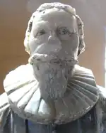 Philip III Courtenay (1547–1611) (son by first wife Dorothy Pollard), married Joane Boyes (died 1586), daughter of John Boyes of Kent. One of their daughters, Lydia, married Richard Culme in Molland Church. Their daughter Elizabeth Courtenay (died 1624) married in 1600[55] to the Hollander Peter Muden, a doctor of medicine, of Butterleigh, three miles south-east of Tiverton. Muden reconstructed Butterleigh parish church[56] and later erected in it a mural monument to his wife which included a female effigy between two children with verse,[57] of which only one fragment survives, a small alabaster statue of a kneeling man.