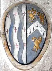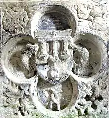 Rogers described as "seemingly portions of a raised tomb"[31] fragments[32] of sculpted stone decorated with gothic quatrefoils and heraldic shields, which stand in Molland Church. These form a small box-like object now situated railed-off on the floor against the east wall of the north aisle under the mural monument to John Courtenay (died 1732). This object was referred to by W.G. Hoskins as "a curious double heart-stone...a receptacle for the hearts of a Courtenay and his wife".[33] The escutcheons show the arms of Courtenay alone and quartering a bend, on which in 1877 were visible three indistinct charges.[34] One escutcheon of Courtenay is supported by two dolphins.[35]