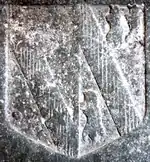 John Bampfield (son) (fl. 14th century), who married Agnes Pederton, daughter and heiress of John Pederton of Hardington,[22] Somerset, by his wife Cecilia Turney, daughter and heiress of John Turney. By his wife he had two sons, the eldest Sir William Bampfield of Poltimore, the youngest Peter Bampfield of Hardington, Somerset. Bamfield and his wife Agnes Pederton rebuilt the Parish Church of Poltimore, as is evidenced by an inscribed ledgerstone, said by Worthy (1896) to have been moved from the nave to the chancel, bearing the following Latin text:[9]