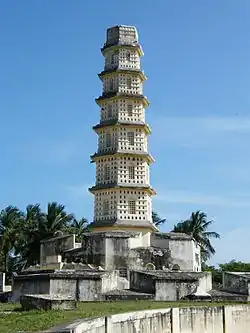 The fort is located in 20 km (12 mi) away from Pattukkottai and 65 km (40 mi) away from Thanjavur in a place called Sarabendrarajanpattinam in shores of Bay of Bengal. The word Manora is believed to be derived from the word minar meaning tower.[7] The fort is hexagonal structure and has eight storeys, raising to a height of 75 ft (23 m) tapering to its top. The tower is surrounded by a wall and a moat ant it resembles a fort. The monument looks like a pagoda, with arched windows, circular staircase and eaves separating one storey from the other.[1][3][4][5][8]