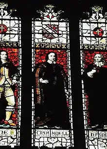 Stained glass window in the college chapel, L-R Sir Henry Vane, Oliver Cromwell and John Hampden