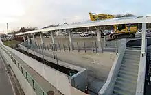 A construction project from 2017 to 2022 improved accessibility at Mansfield station. The project includes replacement of the mini-high platforms, better signage, new ramps and stairs between the platforms and to Route 106, better lighting, improved guardrails, and full paving of all parking lots.[19] Construction began in June 2017.[20] A temporary inbound mini-high platform opened that December, with a similar temporary platform also added on the outbound side.[21] In July 2018, estimated completion was delayed until December 2019 after it was discovered that the ramps would not meet code.[22] The new ramps and stairs opened on March 6, 2020, followed by the outbound mini-high platform on April 27 and the inbound mini-high platform on May 4.[23] Final punch list items lasted into March 2022.[24]