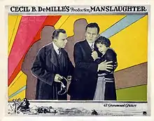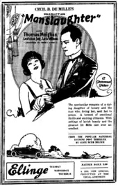 Manslaughter is a 1922 American silent drama film directed by Cecil B. DeMille and starring Thomas Meighan, Leatrice Joy, and Lois Wilson. It was scripted by Jeanie MacPherson adapted from the novel of the same name by Alice Duer Miller. The film portrays the main character, Lydia Thorne, as a thrill-seeking, self-entitled, and wild woman who does not have a reputation of thinking before acting. She acts selfishly by dancing with other men in the presence of her husband and not providing help to her maid who is in dire need for her son's health. As a result of her numerous poor decisions, she is taken to court because of a vehicle accident entailing a high-speed chase she has with a motorcyclist policeman. Following this accident, she is imprisoned for manslaughter after being prosecuted by her husband, Daniel O'Bannon, who is a lawyer. After this endeavor, Lydia comes out of jail to find her husband has become an alcoholic.