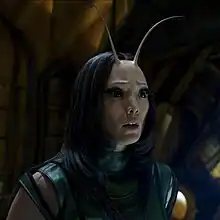 In Guardians of the Galaxy Vol. 2, Mantis is portrayed as a new member of the Guardians with empathic powers who lives with Ego.[6] [7] Executive producer Jonathan Schwartz said the character "has never really experienced social interaction", and learns about "social intricacies" from the other Guardians.[8] Klementieff added, "She was really lonely and by herself, so it's a completely new thing to meet these people and to discover new things", comparing this to a child making awkward mistakes in social situations. Mantis and Drax have an "interesting" relationship in the film due to both being "complete odd balls".[6] Steve Englehart, Mantis' co-creator, was disappointed with the character's portrayal, saying, "That character has nothing to do with Mantis ... I really don't know why you would take a character who is as distinctive as Mantis is and do a completely different character and still call her Mantis."[9]
