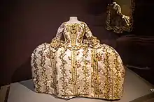 Extant examples of the 17th-century mantua are extremely scarce. Perhaps the only known extant adult-size example is an embroidered wool mantua and petticoat[7] in the Metropolitan Museum of Art's Costume Institute. Norah Waugh has published a pattern taken from this mantua.[8] The Victoria and Albert Museum owns an extremely rare late 17th-century fashion doll dressed in a pink silk mantua and petticoat.[9]